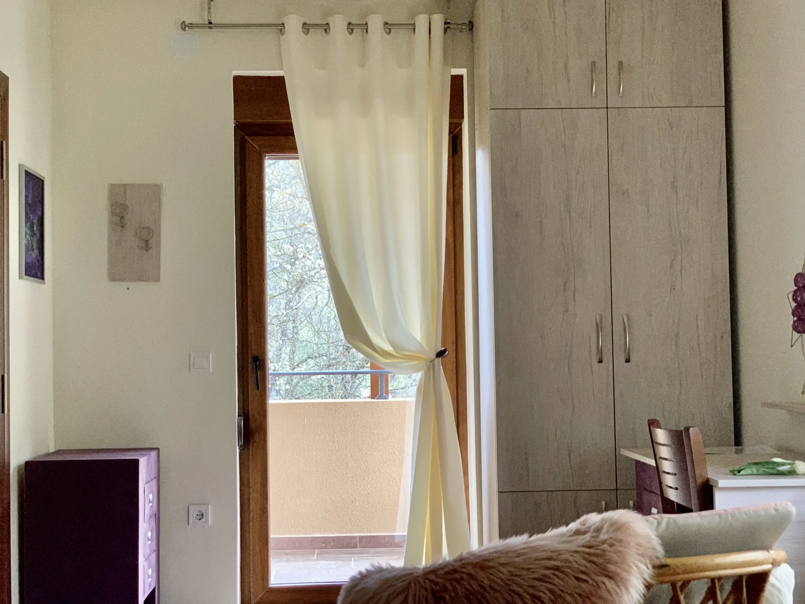 The minimalist interior is complemented by a large balcony with a seating area and views of the surrounding nature. A baby crib can be added on request.