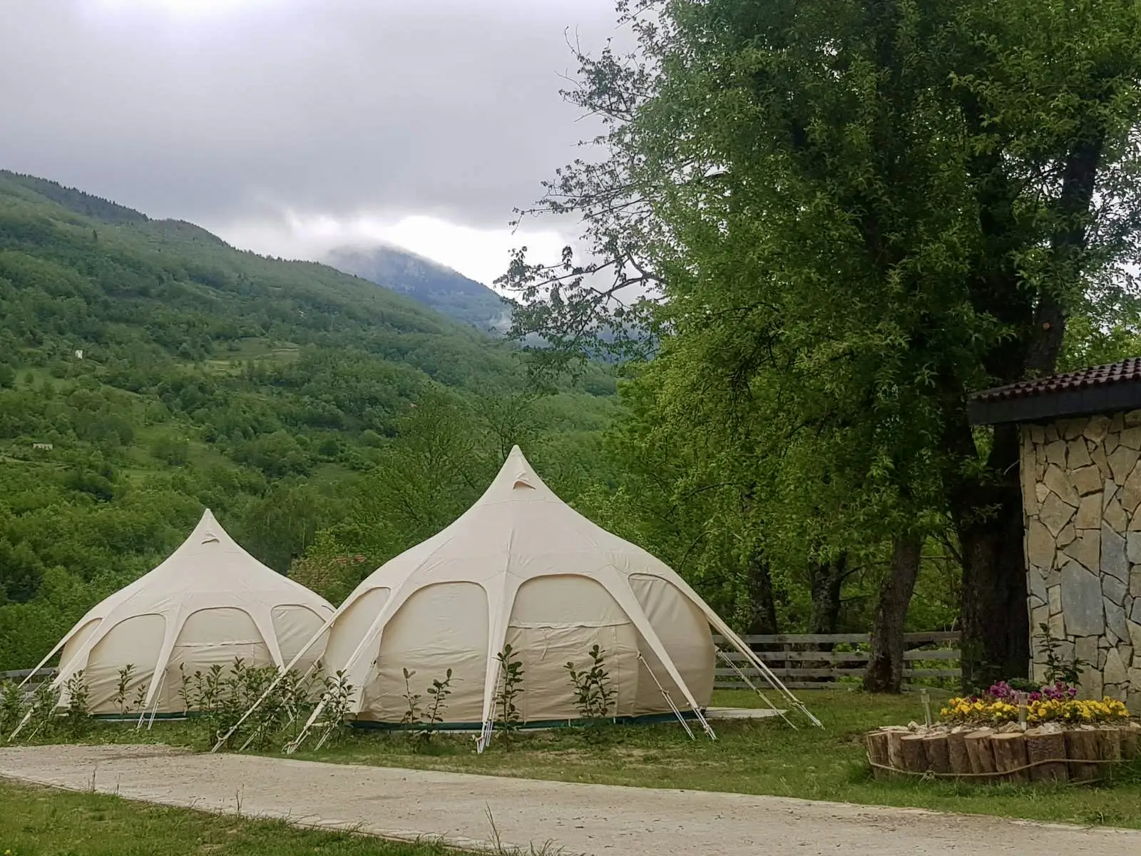 Naši glamping šatori gostima nude mogućnost boravka u prirodi, obezbjeđujući potpuni komfor. Šatori su opremljeni udobnim krevetima, noćnicima i garniturama za sjedenje, kao i kupatilom sa tuš kabinom koje se nalazi u neposrednoj blizini. Gostima glamping šatora je na raspolaganju i restoran hotela.