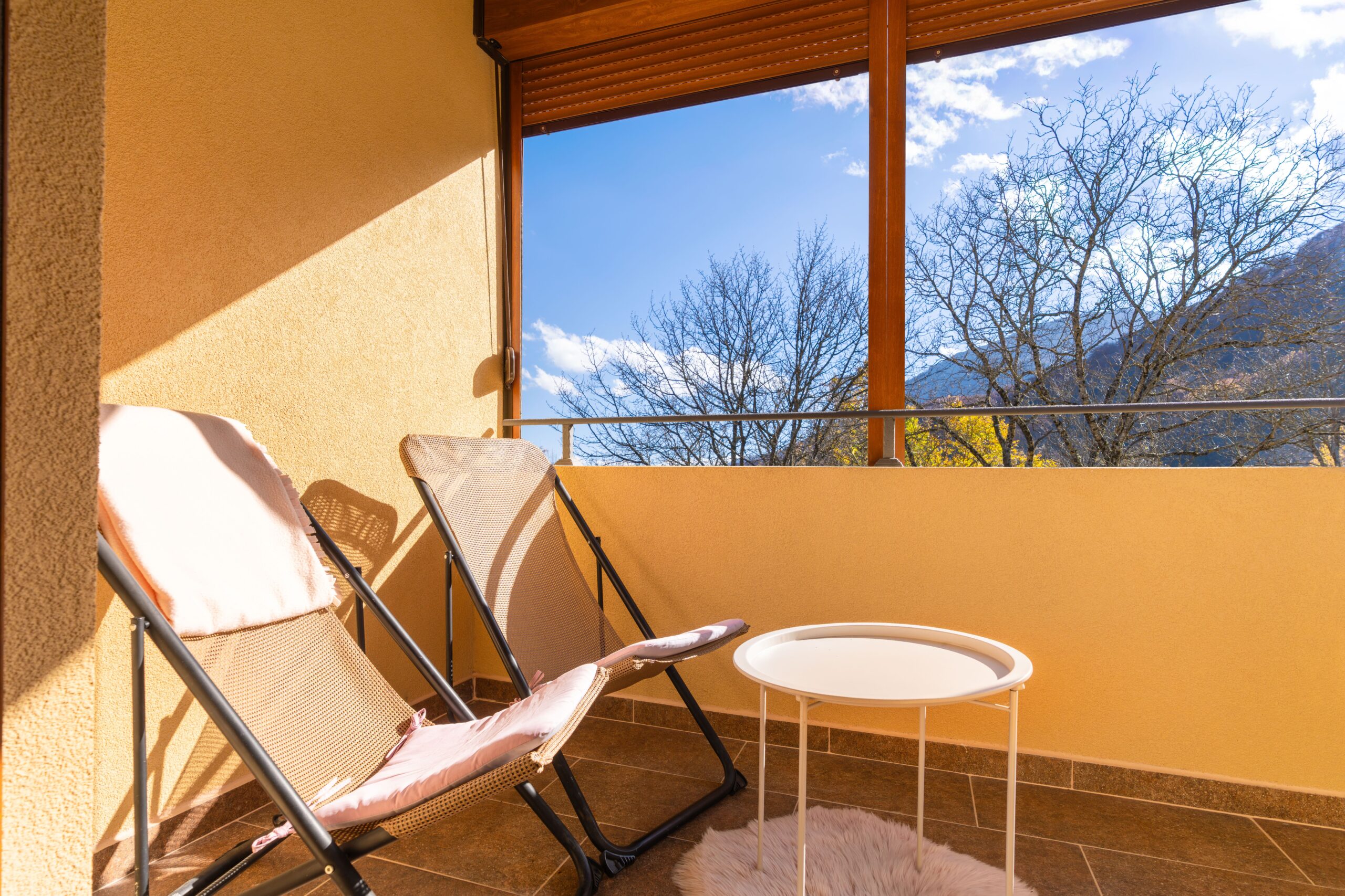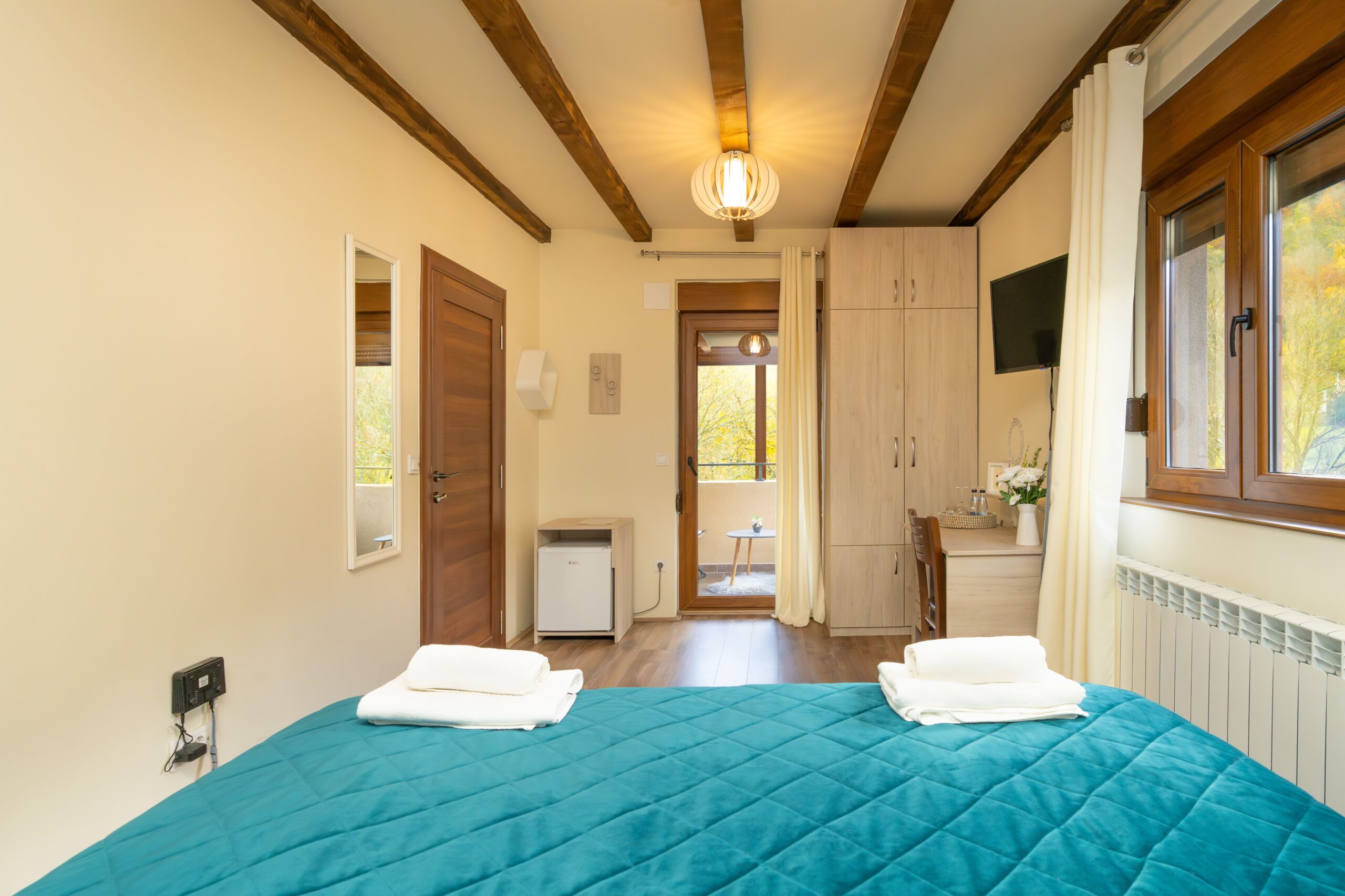 Prijatan i minimalistički enterijer obogaćen je velikim balkonom sa udobnom garniturom i pogledom na prirodu koja okružuje hotel. Gostima na zahtjev u sobu se može dodati krevetić za bebe.